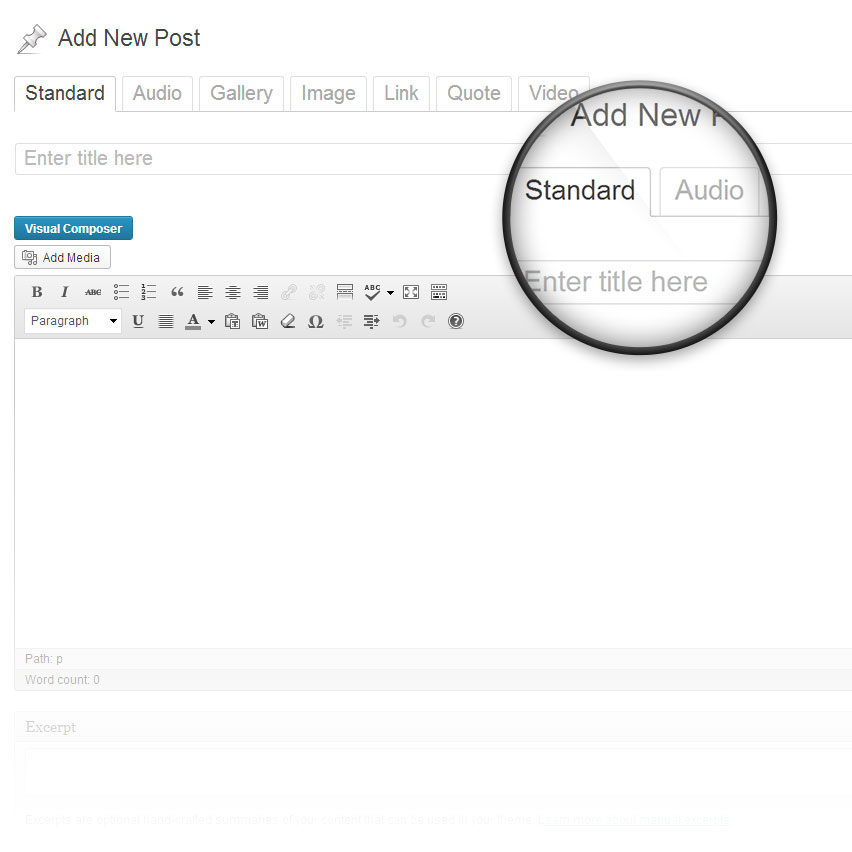 Select your post format using the custom interface with specialized fields for different media. Use images, galleries for slide shows, audio files, self-hosted video, YouTube, Vimeo, Links and Quotes. Each format has a custom styled blog post to feature the selected media.